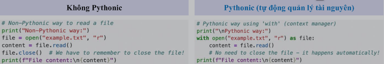 - Context Manager: Context Manager is a resource management mechanism through the with statement, which automatically frees up resources (closing files, closing DB connections, freeing locks…) when the code block ends, even if an error occurs.